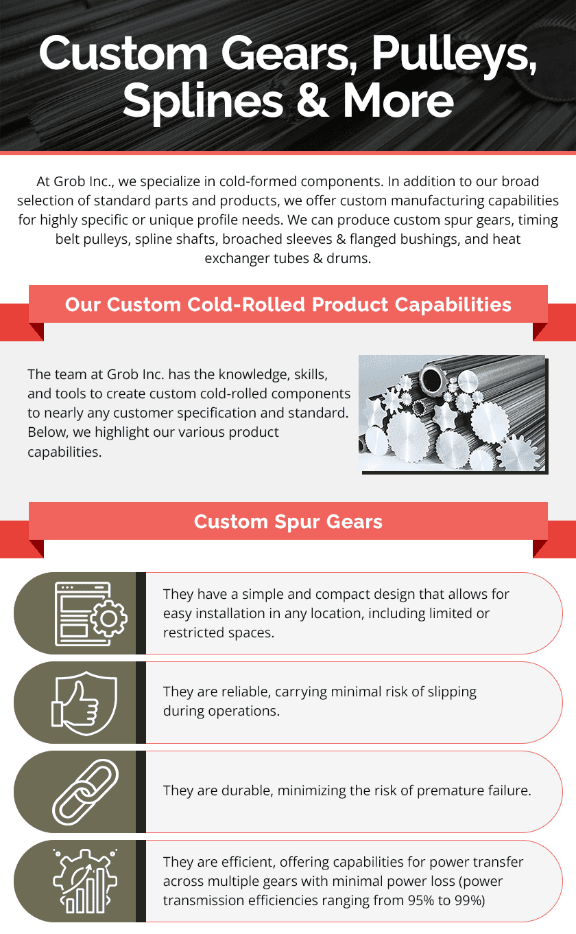Whether you need custom spur gears, timing belt pulleys, spline shafts, broached sleeves & flanged bushings, or heat exchanger tubes & drums, the cold forming experts at Grob Inc. have got you covered. We can provide quality components that meet and/or exceed your expectations.